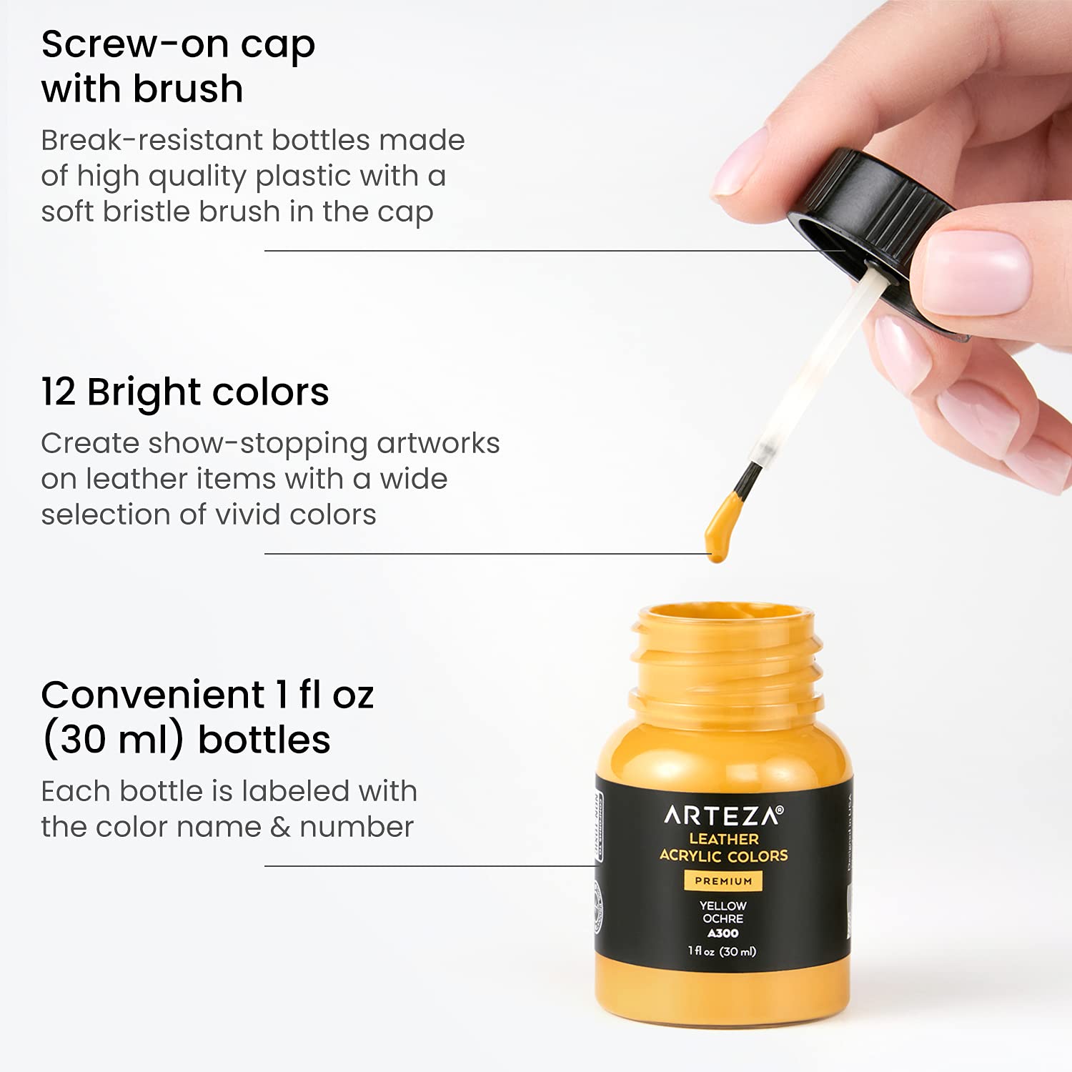 ARTEZA Acrylic Leather Paint, Set of 12, 1 fl oz Bottles, Water-Resistant Fabric Paint for Shoes, Art Supplies for Painting Furniture, Clothes, Belts, Wallets, and Bags—