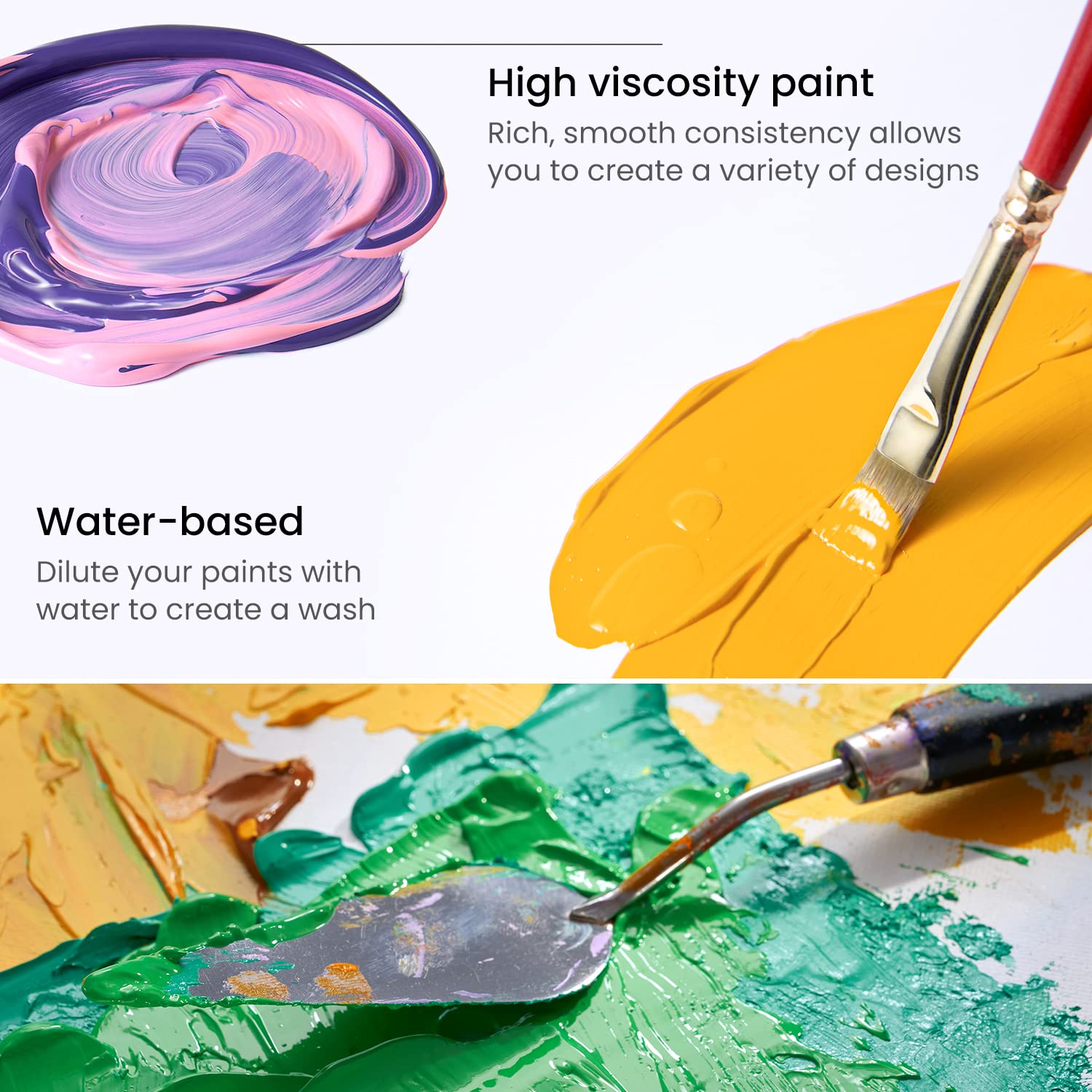 - Works on Virtually Any Surface: This acrylic art paint provides a solid coverage on canvas, primed wood, and paper. Or it can also be mixed with pouring medium and some glitter to create stunning abstract art.