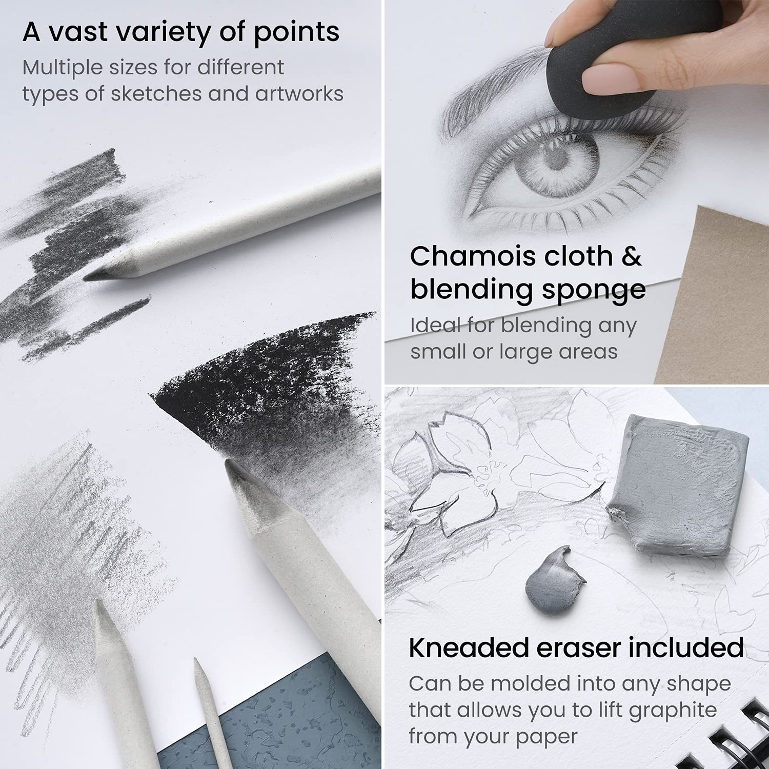 ARTEZA Drawing Kit for Adults – 35-Piece Sketching Set with Blending Stumps, Tortillons, Sanding Blocks, Erasers, Chamois, Pencil Extender and Tools