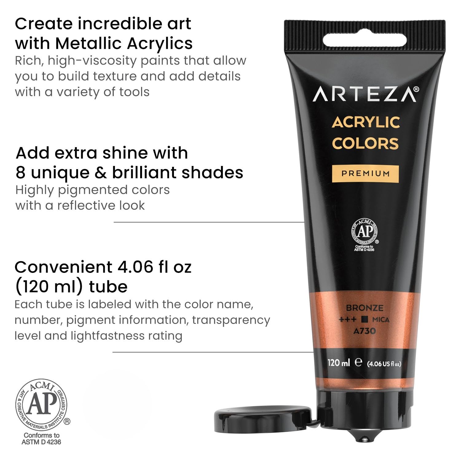 ARTEZA Metallic Acrylic Paint, 8 Metallic Colors in 4.06 ounce Tubes, Artist Paints for Hobby Painters, Art Supplies for Canvas Painting