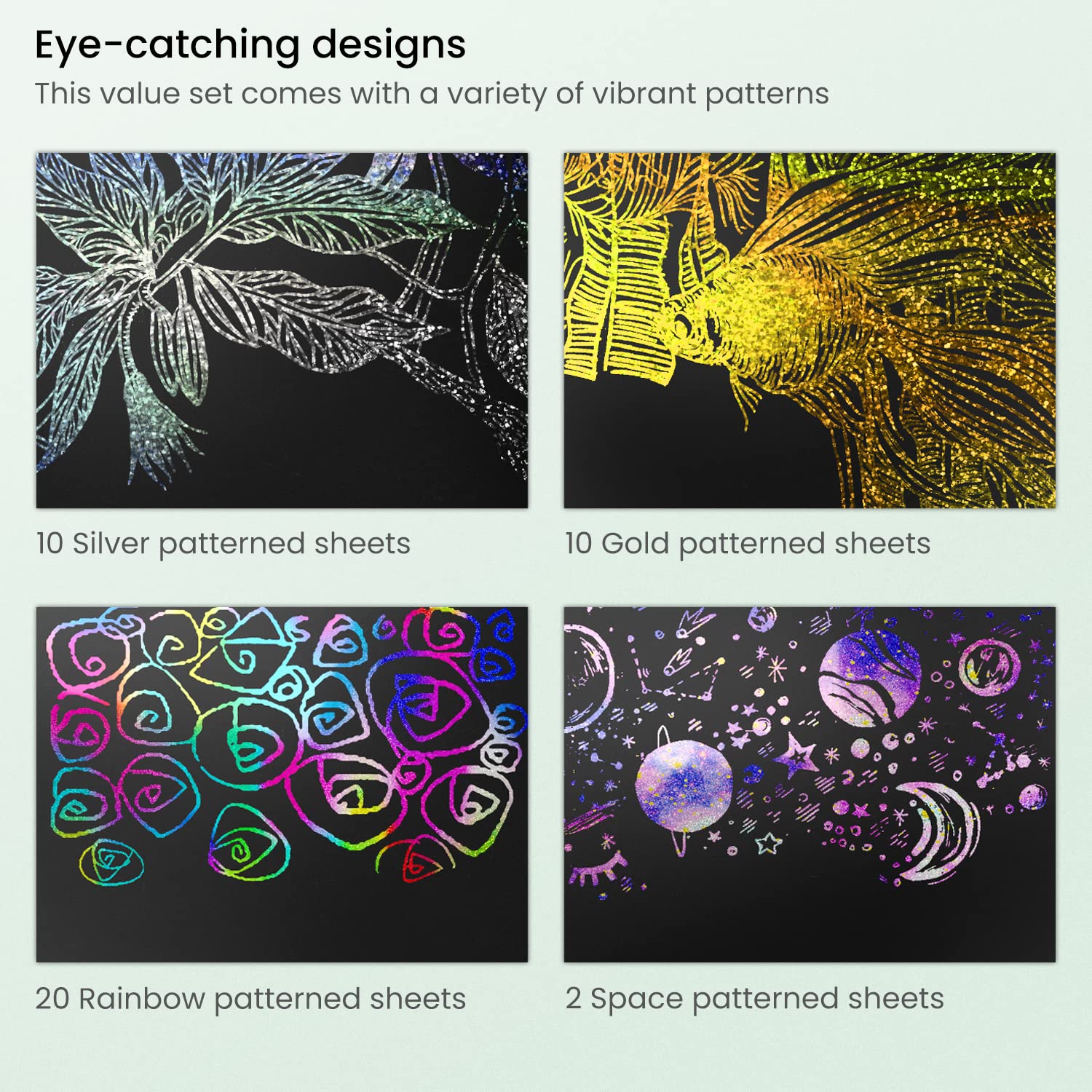 ARTEZA Scratch Paper, Set of 42 Sheets, 10.9 x 8.2 Inches, Includes 4 Unique Patterns, 4 Scratchers, 4 Stencils, 4 Post Cards